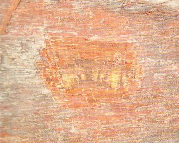 心邊材區(qū)別明顯。心材淺黃褐色,久則轉(zhuǎn)為巧克力褐色。邊材窄,金黃色。生長(zhǎng)輪略可見(jiàn)。