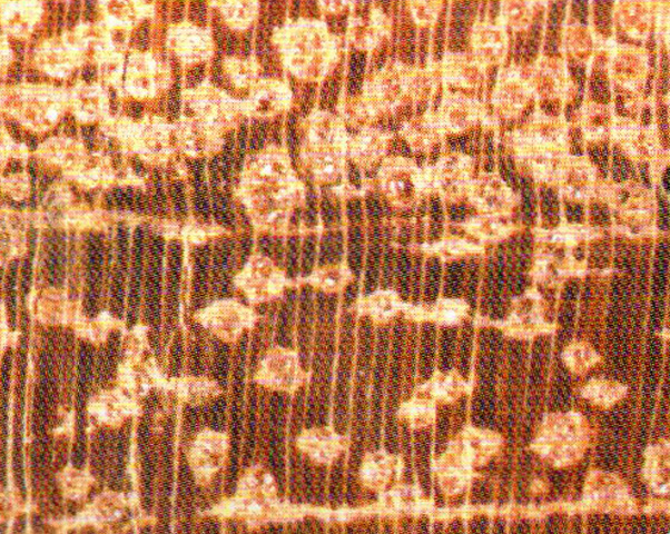 散孔材。管孔肉眼下可見(jiàn),少,略大;主為單管孔,少數(shù)徑列單管孔(2~4個(gè));侵填體豐富。軸向薄壁組織肉眼下可見(jiàn),短翼狀、聚翼狀、環(huán)管束狀及不規(guī)則弦向帶狀。木射線放大鏡下明顯,密度中,窄。