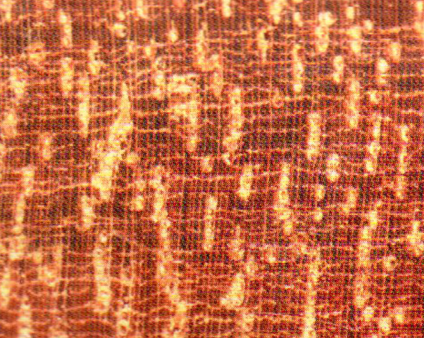 散孔材。管禮放大鏡下明顯,略多,略小;單管孔及經(jīng)列復(fù)管孔(2~5個);經(jīng)向排列明顯;充滿黃白色的沉積物。軸向薄壁組織放大鏡下明顯,弦向線狀,細(xì)而密集,分布均勻,常與木射線構(gòu)成網(wǎng)狀。木射線放大鏡下明顯。密而窄。
